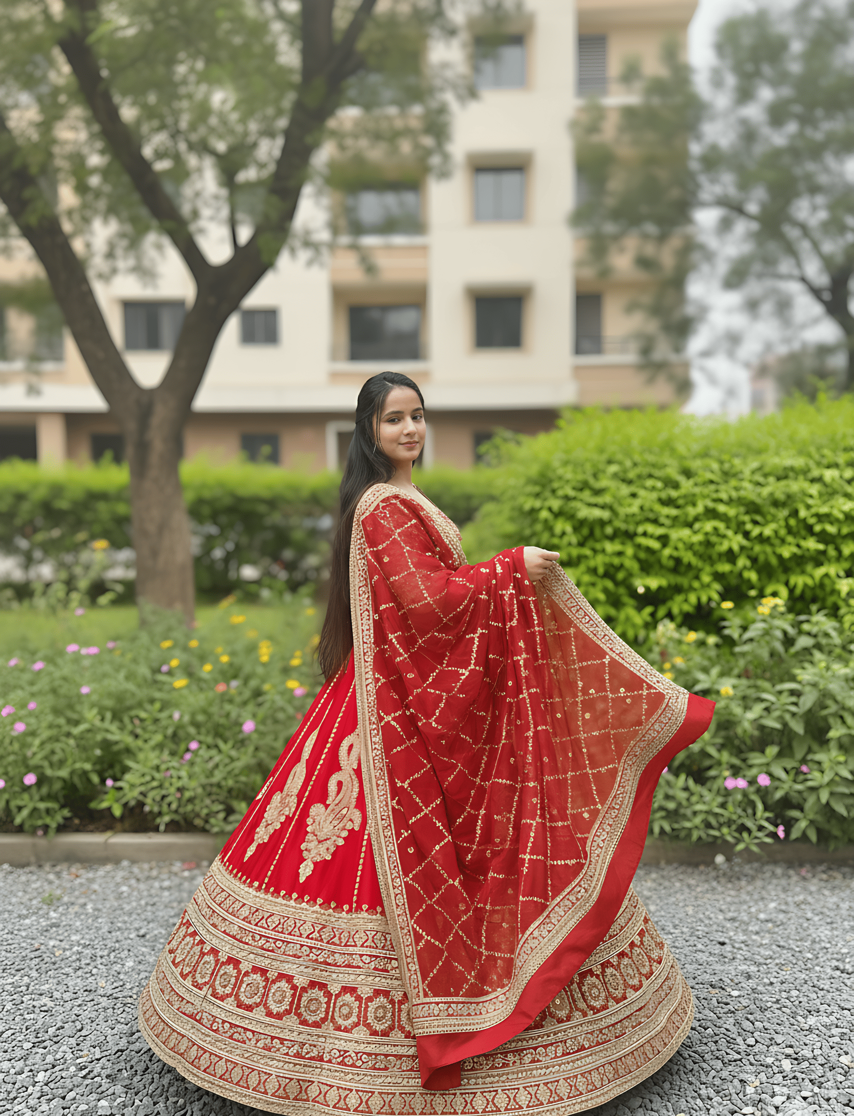 The Sajda Collection (Price: ₹12,600) features a beautifully designed 16-kali lehenga adorned with rich zari embroidery, sequence work, and zarkan detailing, giving it a premium festive appeal. This elegant ensemble comes with a double dupatta, adding a graceful layered drape perfect for weddings and special functions. The blouse is unstitched, allowing personalized tailoring, while the lehenga is semi-stitched for easy fitting. Available in a stunning pink color, this outfit blends tradition with modern elegance.