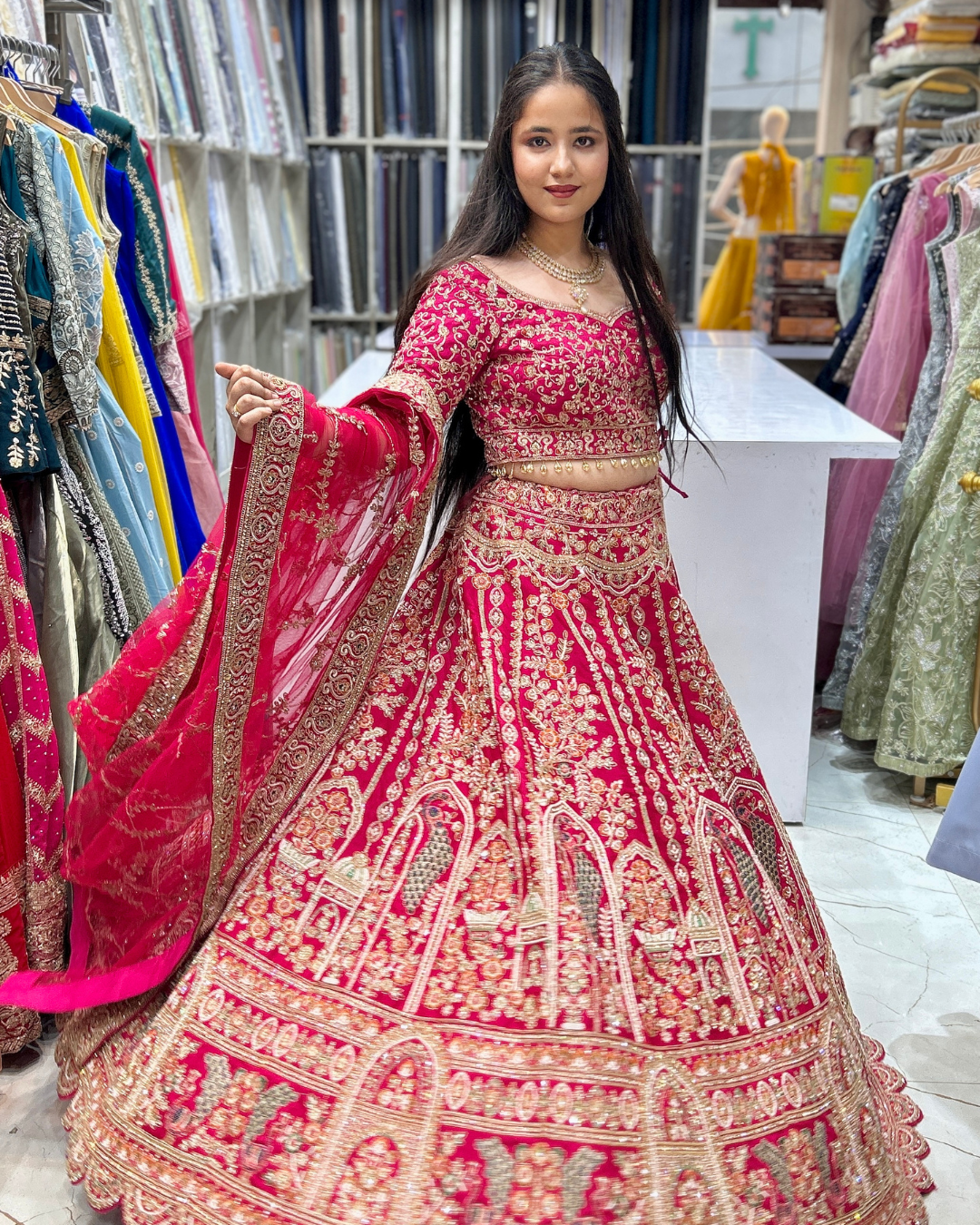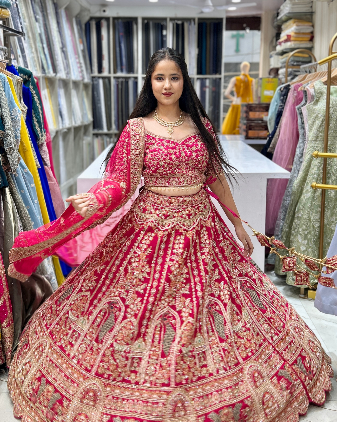 The Shehnai 0007 Lehenga Set is a beautifully crafted 16-kali raw silk lehenga featuring exclusive handwork and elegant minimalistic vertical designs for a sleek, elongated look. The detailing includes refined pearl work and hand-cut dana work, adding sophistication without overpowering the design. Paired with a luxurious double dupatta set, this outfit offers a grand and regal drape. With a waist size of 42 inches and length of 43 inches, it ensures comfort and easy customization, making it perfect for weddings and premium festive occasions.